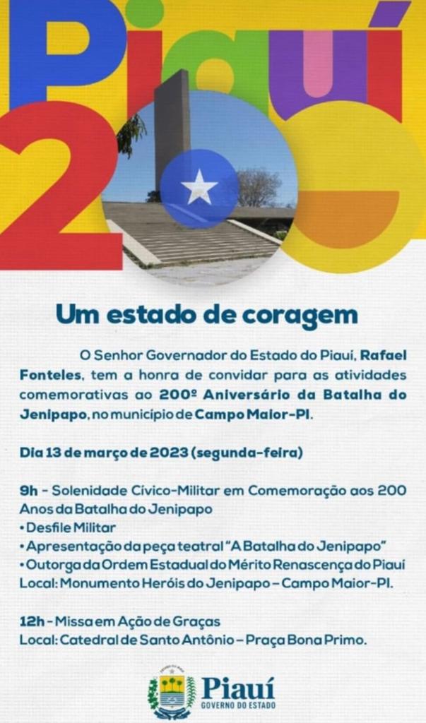 As solenidades alusivas aos 200 anos da Batalha do Jenipapo serão realizadas no dia 13 de março, em Campo Maior, no turno da manhã. A programação divulgada pelo cerimonial do Governo do Estado que contará com solenidades cívico-militar, apresentação de peça teatral, discursos de autoridades e celebração religiosa tradicionamento acontecia no período da tarde.