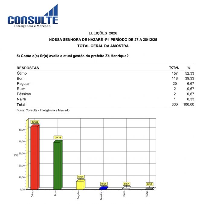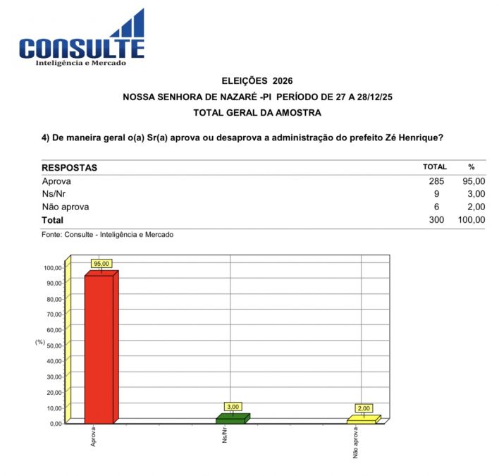 A gestão do prefeito Zé Henrique (PSD), em Nossa Senhora de Nazaré, é aprovada por 95% da população do município, segundo dados de uma pesquisa pesquisa realizada pelo instituto Consulte Inteligência e Mercado.