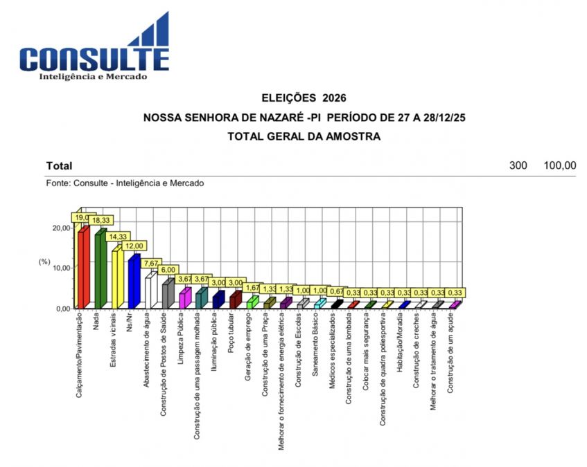 A pesquisa ouviu 300 eleitores de Nossa Senhora de Nazaré nos dias 27 e 28 de dezembro.